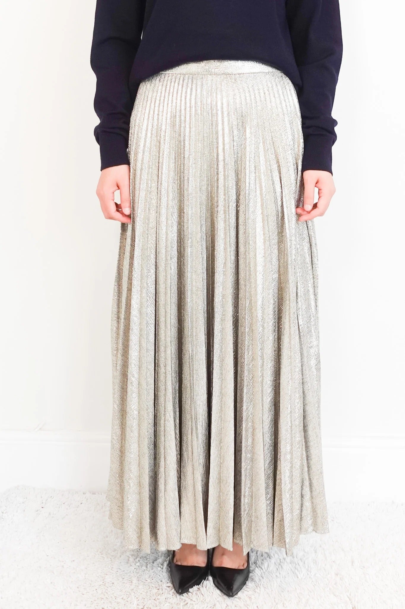 with the Metallic Skirt, featuring a stunning pleated design that catches the light with every movement. Crafted from luxurious metallic finish fabric, this maxi-length skirt offers a perfect blend of elegance and modern glamour. Ideal for making a bold statement at any event, it combines sophisticated style with eye-catching shimmer to ensure you stand out effortlessly.